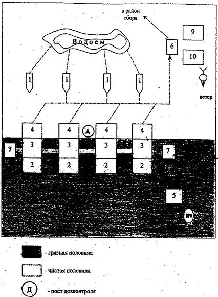 1 – площадки обработки вооружения и техники; 2 – площадки обработки СИЗ; 3 – площадки стрелкового оружия; 4 – площадка санитарной обработки; 5 – площадка замены зараженного обмундирования; 6 – дегазационный пункт; 7 – контрольно-распределительный пост; 8 – командно-наблюдательный пункт.