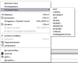 Второй способ связан с обращением к контекстному меню графической зоны экрана (рис. 1.11). В нем первым пунктом обычно выводится название последней обрабатываемой команды, повторный вызов которой легко выполнить, выбрав данный пункт.