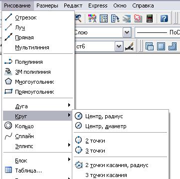 Для того чтобы продолжить выполнение команды, надо выбрать необходимые опции. Их можно выбрать в выпадающем списке опций, вызванных из меню Рисование → Круг, в экранном меню или в контекстном меню (рис.2.3)