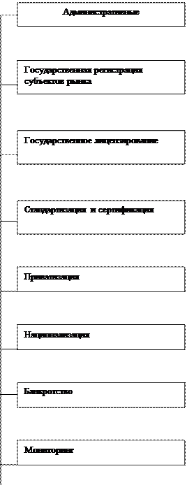 Приватизация и банкротство регулируют порядок смены форм собственности, владельцев предприятия; антимонопольная политика сочетает функции надзора, разрешения и принуждения.