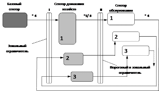 Цифрами обозначены циклы расширения секторов деятельности. Прирост занятых в базовом секторе приводит к 4-кратному приросту числа жителей (сектор домашнего хозяйства) и к увеличению числа занятых в секторе обслуживания (на 8 жителей требуется 1 работник обслуживания). Эти изменения составляют цикл I. Прирост занятых в секторе обслуживания также вызывает прирост населения, что дает начало циклу II.