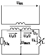 В качестве фазосдвигающих устройств электромагнитных СИФУ чаще всего используют мостовую схему (рисунок 6.2). При этом входное напряжение подается на первичную обмотку трансформаторов, вторичная обмотка которого разделена на две одинаковых полуобмотки, первая из которых вместе с резистивным сопротивлением образует первое плечо моста, вторая полуобмотка вместе с переменной индуктивностью образует второе плечо моста. Выходное напряжение снимается с диагонали моста.