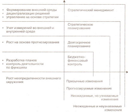 В настоящее время многие ведущие компании мира на основе стратегического планирования перешли на более высокий уровень управления - стратегический менеджмент, который представляет собой четвертый этап. Суть его заключается в том, что фирмы не просто приспосабливаются к динамичным изменениям в окружении, но и воздействуют на внешнюю среду, формируя спрос, моду, вкусы и предпочтение потребителей. Кроме этого, процесс принятия решений и управления передается непосредственно в производственные подразделения фирм, которые руководствуются разработанной и согласованной стратегией. Главный вывод ученых состоит в том, что системы планирования изменялись под воздействием эскалации нестабильности внешнего окружения фирмы: на начальном этапе планирование осуществлялось в относительно стабильных условиях, а внешние и внутренние изменения имели привычный характер; на втором этапе планирование осуществлялось на основе экстраполяции, так как считалось, что характер воздействия факторов внешнего окружения фирмы постоянен в плановом периоде; к 60-м гг. во внешнем окружении фирмы произошли существенные изменения, касающиеся социальных, политических, экономических, технологических и правовых факторов, в результате чего характер их воздействия оказался неожиданным, но узнаваемым в прошлом; на этапе стратегического менеджмента изменения носят неожиданный и неузнаваемый характер.