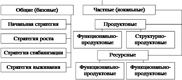 Общие (базовые) стратегии включают в себя начальную стратегию, стратегии роста, стабилизации и выживания, которые разрабатываются применительно к каждой фазе жизненного цикла предприятия и конкретизируются в частных (продуктовых и ресурсных) стратегиях. Данный подход представляет стратегии с точки зрения идеальной организации, фазы жизненных циклов которой совпадают с фазами жизненного цикла основного продукта.