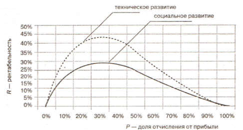 При отчислении от прибыли на социальное развитие 30% - 35% - рентабельность достигает 30%; соответственно, при снижении или, наоборот, увеличении доли отчисления происходит и снижение рентабельности. Аналогичное явление наблюдается и при отчислении от прибыли на техническое развитие, для которого пороговой величиной является 40-45% (рис. 11.1).