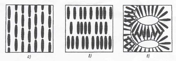 В смектических, жидких кристаллах параллельно ориентированные молекулы упакованы в слои (рисунок 1,16, б) и таким образом имеют большую степень упорядочения. Если одно и то же вещество может находиться в обеих жидкокристаллических модификациях, то смектическая фаза расположена по температуре ближе к твердой фазе, чем нематическая. Например, в n-гептилоксибензойной кислоте происходят следующие фазовые превращения с повышением температуры: