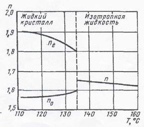 Рисунок 1.17 – Температурная зависимость показателей преломления параазоксианизола в направлении паралелльном (n0) и перпендикулярном (n1) молекулярным осям