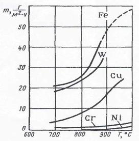 Рисунок 3.3 – Зависимость скорости окисления металла (количество окисляющегося металла за час с квадратного метра поверхности металла, соприкасающейся с воздухом) от температуры