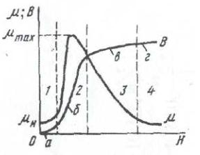 ферромагнитного материала в области очень слабых полей(1), слабых полей(2), средних полей(3) и сильных полей(4).
