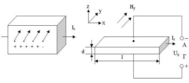 Если пропустить через пластину ПП электрический ток (как показано на рисунке 5.21) по направлению оси Х, а затем создать магнитное поле Ну перпендикулярное направлению тока, то на противоположных гранях (по оси Z) появиться ЭДС Холла.