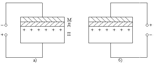 В трехслойной структуре состоящей: металла М, диэлектрика Д и полупроводника П, то на поверхности полупроводника, за счет воздействия электрического поля, произойдет разделение зарядов. Электроны будут вытесняться эл. полем, вместо них образуются дырки и, таким образом, возникает обогащенный дырками приповерхностный р-слой с повышенной проводимостью (рисунок 5.25 а).