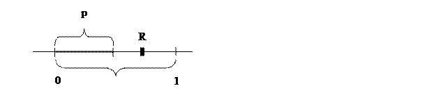 Пусть событие A имеет вероятность p. Изобразим отрезок [0,1] и соответствующую событию вероятность на графике. Разыграем (сгенерируем) случайное число R, и если оно окажется меньше p, будем считать, что событие произошло, в противном случае – нет (на рисунке изображен как раз такой случай, т.к.