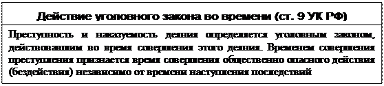 Согласно ч. 1 ст. 9 УК преступность и наказуемость деяния определяются уголовным законом, действовавшим во время совершения этого деяния. Это значит, что к лицу, совершившему преступление, применяется только тот закон, который действовал во время его совершения. Действующим считается такой уголовный закон, который вступил в силу и не утратил ее. Утрачивает силу уголовный закон в результате его отмены, замены другим законом по истечении указанного в нем срока или в связи с изменением условий или обстоятельств, в соответствии с которыми он был принят.