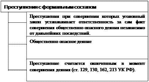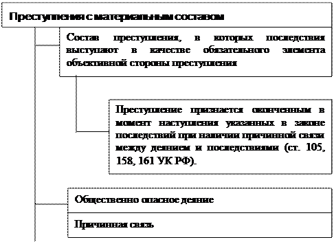 В теории уголовного права объективная сторона преступления является наиболее сложным и объемным учением. Это внешняя сторона преступления, исследование которой позволяет судить не только о данном элементе состава, но и определять объект посягательства и устанавливать форму вины.Объективная сторона преступления состоит из общественно опасного деяния (действия или бездействия), преступного последствия и причинной связи между данным последствием и деянием. Указанные элементы объективной стороны принято относить к ее основным признакам.Однако помимо основных признаков в объективную сторону входят факультативные признаки преступления: время, место совершения преступления, способ, обстановка, орудия и средства преступления.Поскольку объективная сторона по сути является фундаментом всей конструкции состава преступления и представляет собой основное содержание диспозиции статей Особенной части УК РФ, то прежде всего ее признаки положены в основу предмета доказывания в уголовном процессе.Объективная сторона преступления конструируется двояко. В одних случаях ее образуют общественно опасное деяние (действие или бездействие), преступное последствие и причинная связь между ними, в других — только общественно опасное деяние, независимо от последствия. От этого зависит вид состава преступления. В первом случае он будет материальным, а во втором — формальным (см: схема 10). Схема 10.1.![]() |