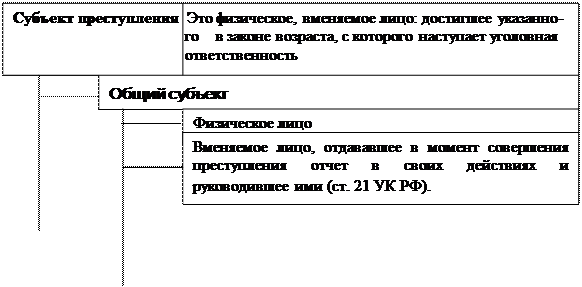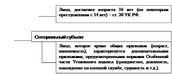 | 3. Субъект преступления | Вменяемость. Достижение указанного законом возраста | Признаки специального субъекта |