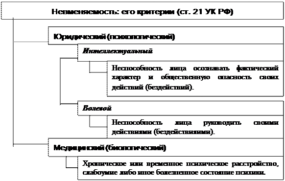 2. С какого возраста наступает уголовная ответственность? Возраст и его влияние на уголовную ответственность следует рассматривать через призму ст. 20 УК. Ст. 20 ч. 1 устанавливает, что уголовной ответственности подлежат лица, которым до совершения преступления исполнилось 16 лет.Согласно ч. 2 данной статьи лица, совершившие преступление в возрасте 14 лет подлежат уголовной ответственности за общественно опасные деяния, указанные в ней.При определении возраста, с достижением которого наступает уголовная ответственность за совершенное преступление, за основу берется уровень сознания человека, его способность осознавать фактическую сторону совершаемого им деяния и общественную опасность.При этом учитывается тяжесть преступления, распространенность его, когда речь идет о 14-летних подростках и другие факторы, влияющие на уголовную ответственность несовершеннолетних.За некоторые преступления ответственность наступает по достижении 18-летнего возраста, что вытекает из признаков того или иного преступления, предусмотренного статьями Особенной части УК РФ (ст.ст. 134, 150, 152 и др.). 3. Что такое вменяемость и невменяемость? Вменяемость определяется как способность лица отдавать отчет в своих действиях и руководить ими. Эта способность у психически нормального лица развивается с возрастом. Поэтому минимальный возраст уголовной ответственности установлен в законодательстве – 14-16 лет.Таким образом, уголовной ответственности подлежит только человек, обладающий нормальными умственными и волевыми качествами, человек с нормальной психикой.Что же касается невменяемости, то это противоположное понятие вменяемости.Невменяемость – это неспособность лица отдавать отчет в своих действиях или руководить ими вследствие болезненного состояния психики (ст. 21 УК).Лицо, совершившее преступление в невменяемом состоянии, уголовной ответственности не подлежит, так как в его поступке отсутствует вина.Понятие невменяемости складывается из двух критериев (признаков): 1) медицинского (биологического); 2) юридического (психологического).Под медицинским критерием в уголовном праве РФ и судебной психиатрии понимаются различные виды психических заболеваний: а) хроническое психическое расстройство; б) временное психическое расстройство; в) слабоумие; г) иное болезненное состояние психики.Юридический критерий свидетельствует о том, что болезнь находится в такой степени, что больной не способен отдавать себе отчета в своих действиях или руководить ими.Таким образом, юридический критерий складывается из двух признаков: 1) интеллектуального; 2) волевого; т. е. в первом случае это неспособность лица отдавать себе отчет в своих действиях и во втором — неспособность лица руководить своим поведением (см: схема 14).![]() |