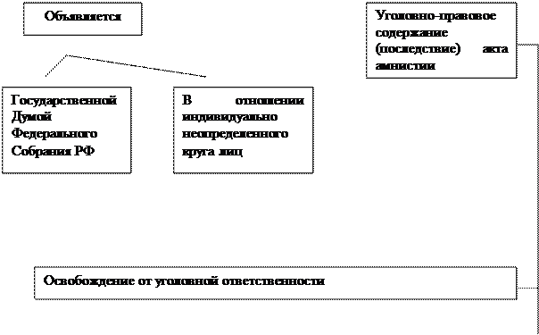 Объявление амнистии означает освобождение от уголовной ответственности или наказания, полностью или частично, определенной категории лиц, не обозначенных индивидуально. Актами амнистии может быть также предусмотрена замена наказания на более мягкое, снятие судимости. Право на издание актов амнистии принадлежит в соответствии с п. «е» ч. 1 ст. 103 Конституции Российской Федерации Государственной Думе Федерального Собрания Российской Федерации.