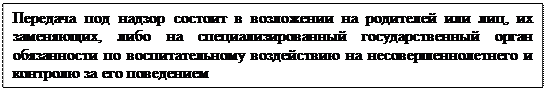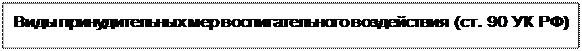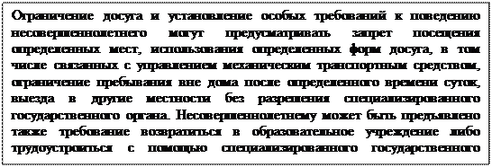 В УК (ст. 90) предусмотрены следующие принудительные меры воспитательного характера: предупреждение; передача под надзор родителей или лиц, их заменяющих, либо специализированного государственного органа; возложение обязанности возместить причиненный ущерб; ограничение досуга и установление особых требований к поведению несовершеннолетнего. Эти положения дают возможность суду и правоохранительным органам индивидуализировать ответственность несовершеннолетних и проявлять к ним обоснованную гуманность (см: схема 42).
