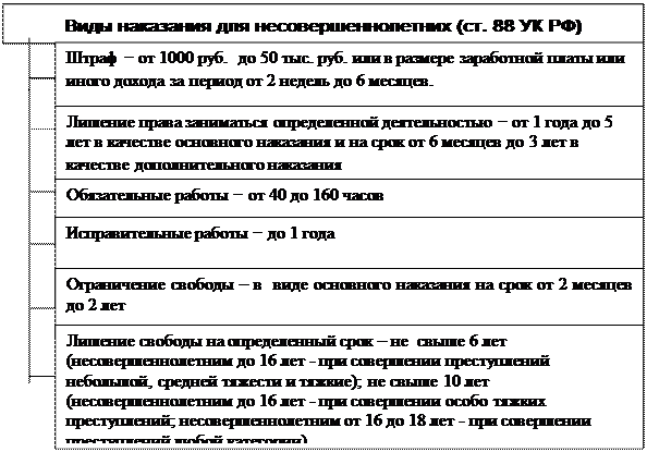 Для несовершеннолетних установлены специальные положения по отдельным видам наказания. Так, к несовершеннолетнимне применяется смертная казнь, а лишение свободы не может быть назначено свыше десяти лет (ст. 59 и 88 УК) (см: схема 43).