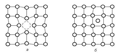 | Рисунок 1.14. Схема точечных дефектов в атомном строении металлов: а - вакансия; б - дислоцированный атом |