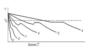 | Рисунок 2.4. Термические кривые кристаллизации при различных скоростях охлаждения: от а до е - увеличение скорости охлаждения системы |
