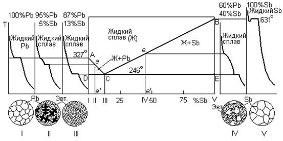 Вся диаграмма состоит из четырех областей. Выше линии ACB сплав находится в виде однородного жидкого раствора. В области ACD смесь жидкой фазы и кристаллов свинца. В области BCE твердожидкое состояние, состоящее из жидкой фазы и кристаллов сурьмы. Ниже линии эвтектики DCE сплав находится в твердом состоянии. Причем при содержании Sb до 13% затвердевший сплав состоит из избыточных кристаллов свинца и эвтектики являющейся физико-химической смесью мелкодисперсных частиц свинца и сурьмы. Сплав, содержащий более 13% - заэвтектическим. Заэвтектический сплав содержит избыток кристаллов сурьмы и эвтектику.