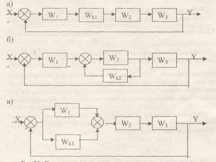 Рис. 9.5. Варианты включения корректирующих устройств: а – последовательно, б – встречно-параллельно, в – параллельно.