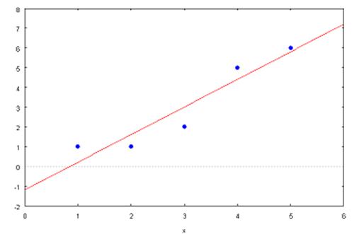 Нарисуем график с помощью MAXIMы: введем xy: [[1, 1], [2, 1], [3, 2], [4, 5], [5, 6]]; plot2d([[discrete, xy], 7/5*x-6/5], [x,0,6],[style, points, lines]); и нажмем Shift+Enter. Получим