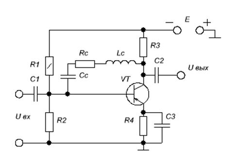Индуктивность L здесь берут настолько малой, что её влияние сказывается только в области верхних частот. На нижних и средних частотах рассматриваемая схема обладает такими же свойствами, как обычный резисторный каскад.