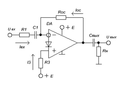 Основная схема включения ТОУ – инвертирующий усилитель по переменному току (рисунок 1.91).В инвертирующем включении ТОУ любое приращение входного тока во входной цепи может компенсироваться только по цепи ОС, т.е.
