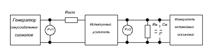 1 Определение динамического диапазона усилителя. Схема измерений (рисунок 1.93) состоит из генератора синусоидальных сигналов, вольтметра PV1, с помощью которого контролируют напряжение на входе усилителя, эквивалента внутреннего сопротивления источника сигнала Rист испытуемого усилителя.