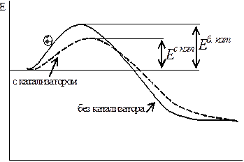 При вводе катализатора (рис. 11) реакция может протекать по иному пути с меньшим энергетическим барьером. Этот путь соответствует новому механизму реакции через образование другого активированного комплекса. И новый более низкий энергетический барьер может преодолеть большее число частиц, что и приводит к увеличению скорости реакции.