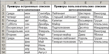 Список автозаполнения — список текстовых значений, расположенных в определенном порядке. Если при автозаполнении в первой ячейке диапазона находится значение, принадлежащее одному из списков, то остальные ячейки будут последовательно заполнены значениями из этого списка (см. рис). Для создания собственного списка Автозаполнения выполните следующие действия: