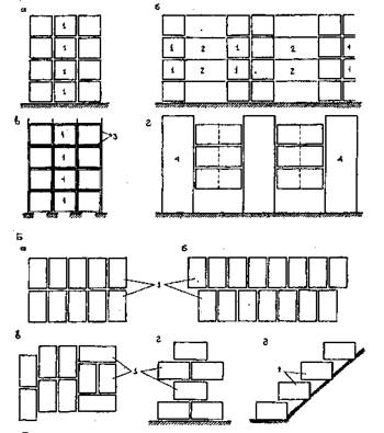 В зависимости от положения объемных блоков по высоте различают конструктивные схемы плоские и со сдвижками (рис. 5.39, Б). Сдвижка блоков обычно продольная, горизонтальная с образованием консольно- выступающих или западающих за плоскость фасада блоков.