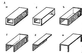 а - по количеству и виду ограждающих конструкций.- а - замкнутый; б — открытый с одной стороны: в — открытый с двух противоположных сторон; г — открытый с двух противоположных вертикальных сторон и одной горизонтальной; д — двухгранный угол; е — столик; Б — по форме: а -прямоугольные: б — косоугольные; в, г — криволинейные