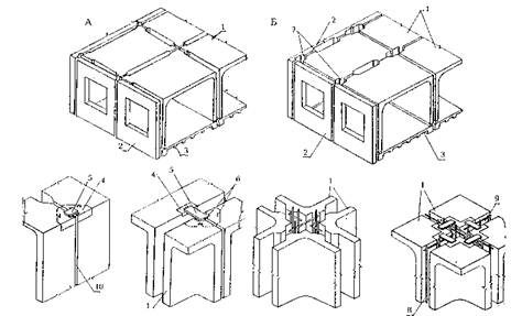 Объемные блоки, устанавливаемые друг на друга столбами, соединяются друг с другом при помощи гибких (обычные условия строительства) или жестких связей (особые условия строительства, а, именно, большие ветровые нагрузки и высота зданий более девяти этажей, сейсмические воздействия ит.д.).