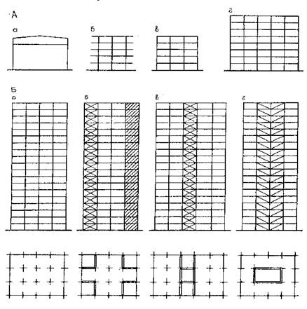 А - виды каркасных зданий: а — одноэтажное однопролетное; б, в, г — многоэтажное, двух-, трех- и многопролетное; б - с консолями; в, г — без консолей; Б - компоновочные схемы каркасных зданий: а —рамная; б—рамно-связевая; в — связевая; г - каркасно-ствольная