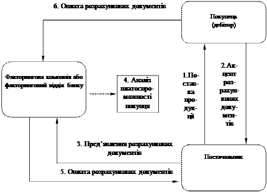 Факторинг - це операція, що поєднує в собі кредитування клієнта з метою формування обігового капіталу, а також ряд посередницько-комісійних послуг. Суть факторингу полягає в тому, що банк купує у клієнта право на вимогу боргу. Як правило, банком купуються дебіторські рахунки, пов'язані з поставкою товарів чи наданням послуг. Також банк може надавати клієнту ряд інших послуг, таких як ведення бухгалтерії, інформаційні, юридичні послуги.