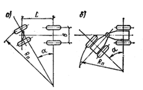 где а — максимально возможный угол поворота наружного колеса; чем больше а, тем меньше радиус поворота Rп машины.