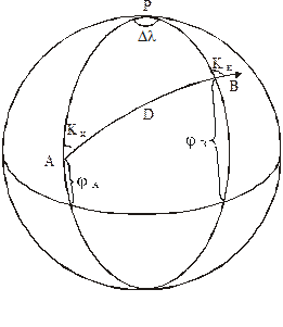Точкой Р обозначен полюс. Координаты точек А и В заданы. Это означает, что известны стороны РА и РВ (дополнение соответствующих широт до 90о) и сферический угол при полюсе (разность долгот). Требуется найти плавание D, курс начальный К н и конечный – К к.