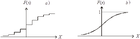 Рис. 3.1. Функции распределения случайных величин: а) дискретная; б) непрерывная