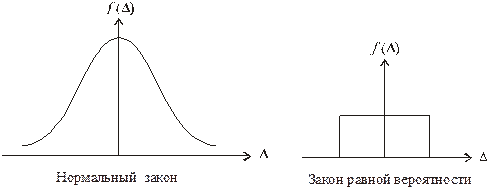 Случайные погрешности распределены, в основном, по нормальному закону и иногда по равномерному закону. Графики этих распределений показаны на рис. 3.3 и 3.4. Если начало отсчета на этих графиках перенести в математическое ожидание, получим распределения случайных погрешностей. Они показаны на рис. 4.1. На этом рисунке случайная погрешность обозначена