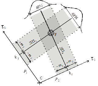 Чтобы выяснить геометрическую фигуру границы, проходящей через точки равной вероятности, обратимся к рис. 6.4. На нем показана обсервованная точка F и два направления градиентов навигационных параметров, по которым определялось место судна. Вдоль этих направлений действуют случайные погрешности, распределенные по нормальному закону.