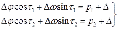 Δφ (cos τ 1 − cos τ 2) + Δω(sin τ 1 − sin τ 2 ) = р 1 − р 2 .