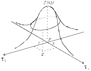 Вероятность того, что будут одновременно допущены погрешности х и у, равна произведению их вероятностей. Геометрически двумерная плотность вероятности представляет собой холмообразную поверхность, показанную на рис. 6.4.