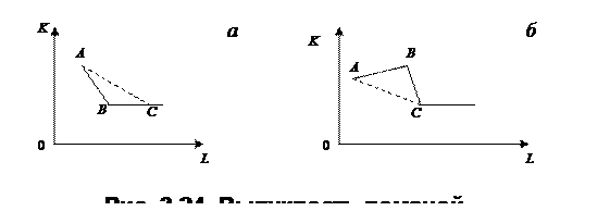 Если изокванта вогнута относительно начала координат (рис. 3.24 б), то затраты факторов производства на линиях