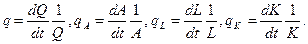 как отношения приращения этих показателей во времени к их абсолютному значению и обозначим соответственно через