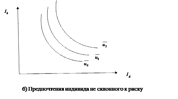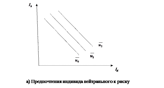 Субъекта не склонного к риску интересует величина ожидаемого дохода. Его кривые безразличия представляют прямые линии с наклоном