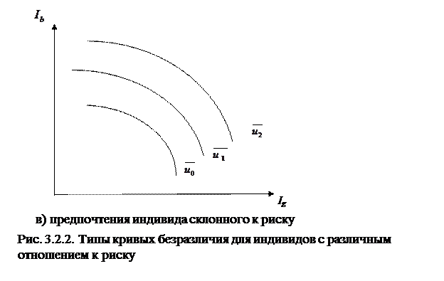 Для субъекта склонного к риску, рис 3.2.4.в, кривые безразличия характеризуются увеличивающейся предельной нормой замещения. Поэтому оптимум в таком случае возможен лишь в краевых точках. Если первоначальный доход отмечается точкой