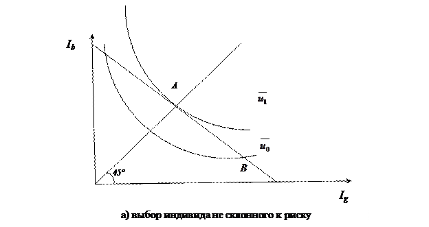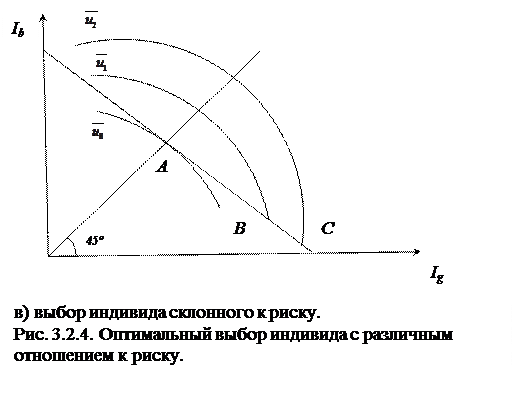 , рис. 3.2.4б. Кривая безразличия лежит поверх бюджетной линии – линии ожидаемого дохода и для него представляет интерес любая точка на кривой безразличия (